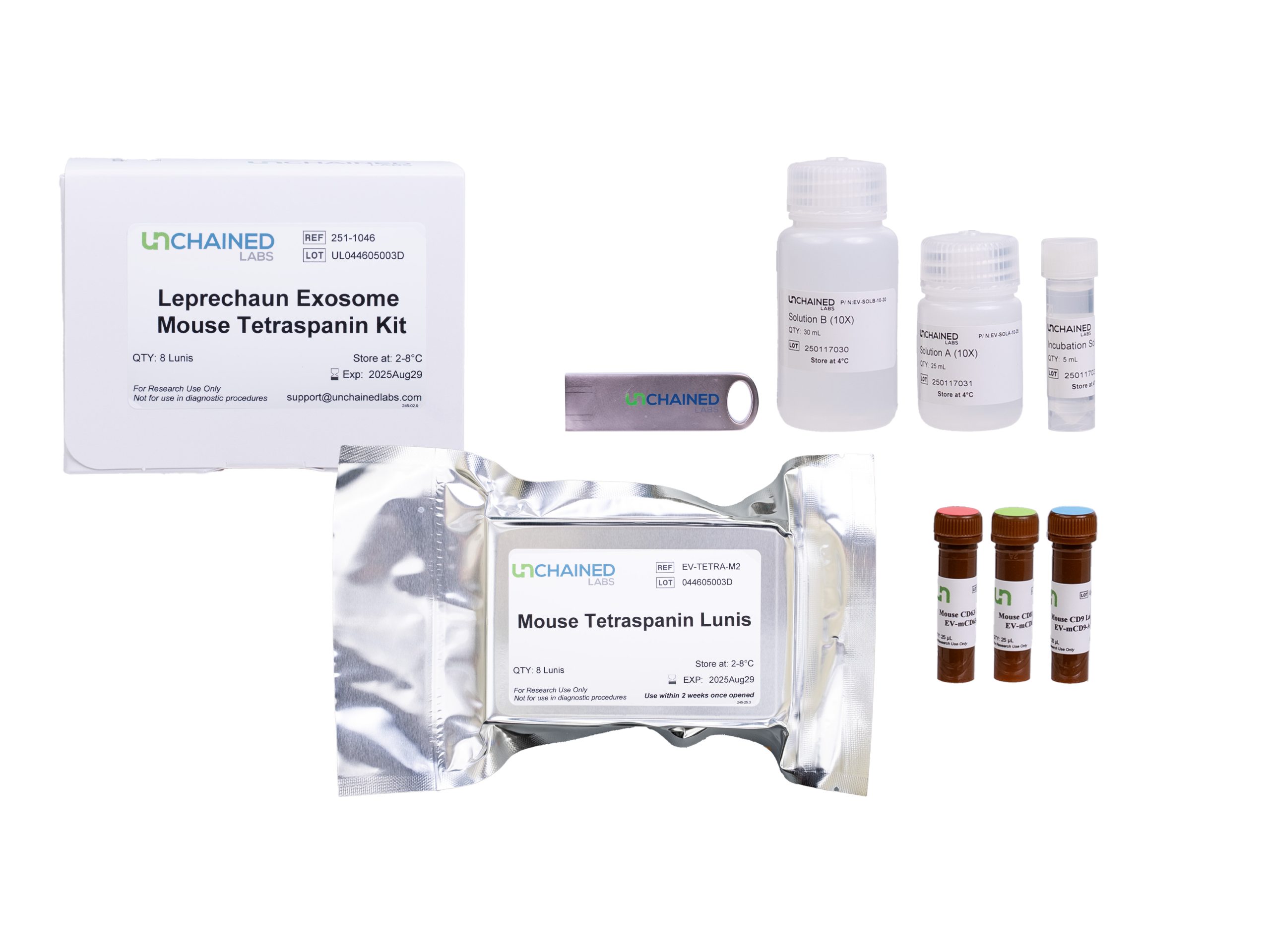 Exosome Mouse Tetraspanin Kit. Contains 8 Lunis with anti-mCD81, anti-mCD9 and IgG control spots, and anti-mCD81-CF555, anti-mCD9-CF488 and anti-mCD63-CF647. Contains 1 x Incubation Solution (10x) 10 ml, 1 x Solution A (10x) 25 ml, 1 x Solution B (10x) 30 ml.