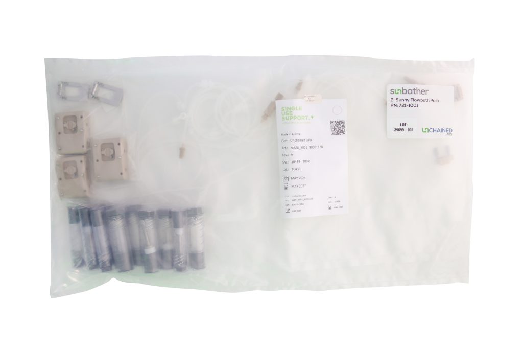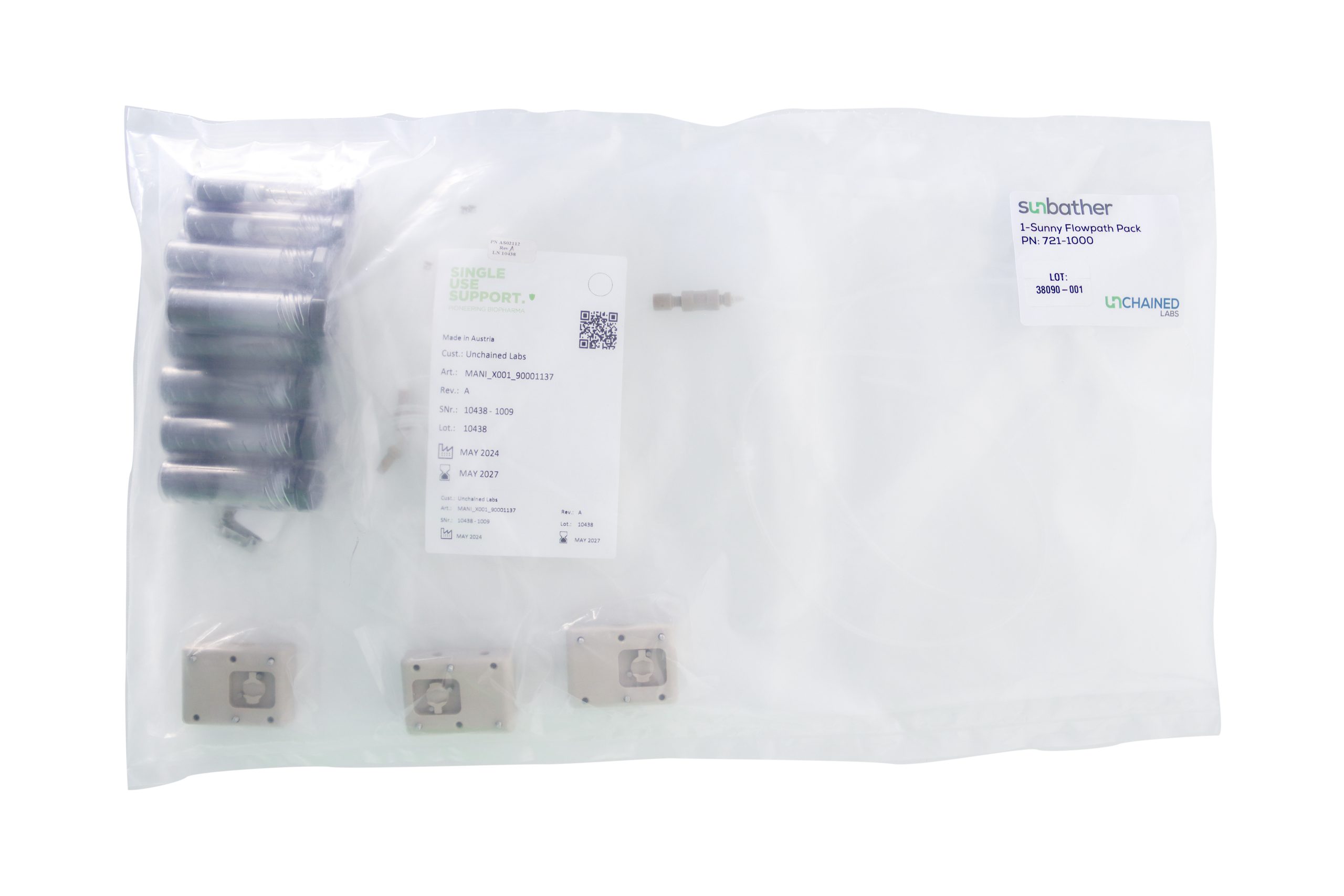 A complete wetted flowpath for use with the Sunbather instrument running a 1-Sunny configuration. Partially Assembled and double bagged. Non-sterile (requires sanitization before use)