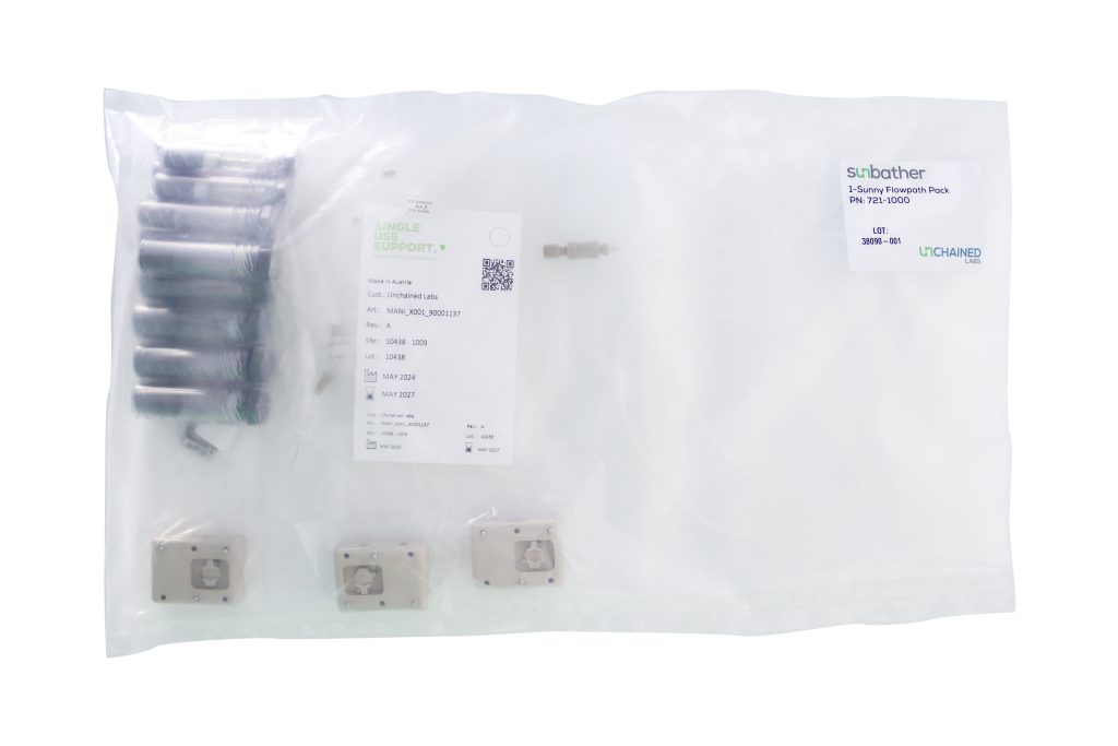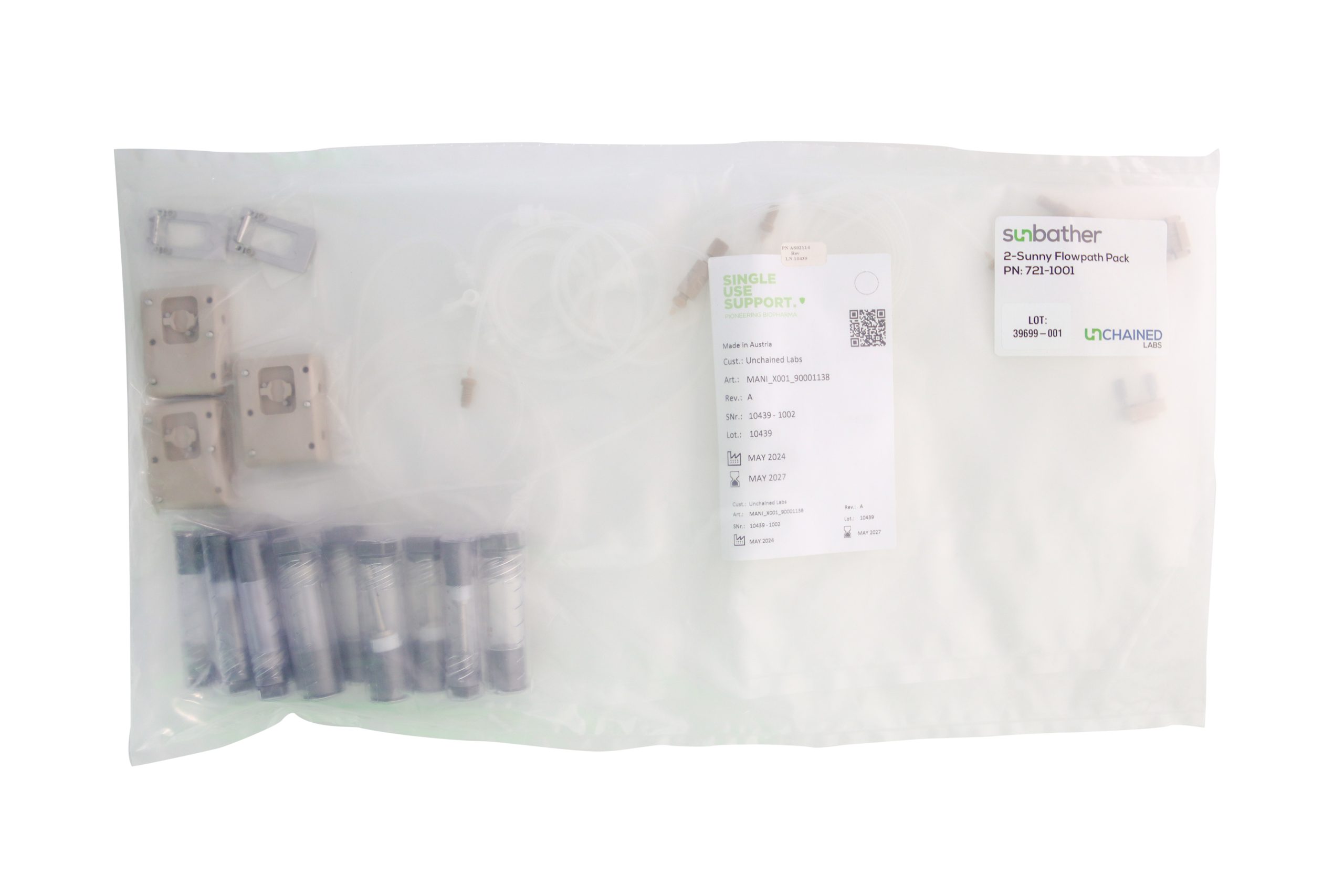 A complete wetted flowpath for use with the Sunbather instrument running a sequential 2-Sunny configuration. Partially Assembled and double bagged. Non-sterile (requires sanitization before use)